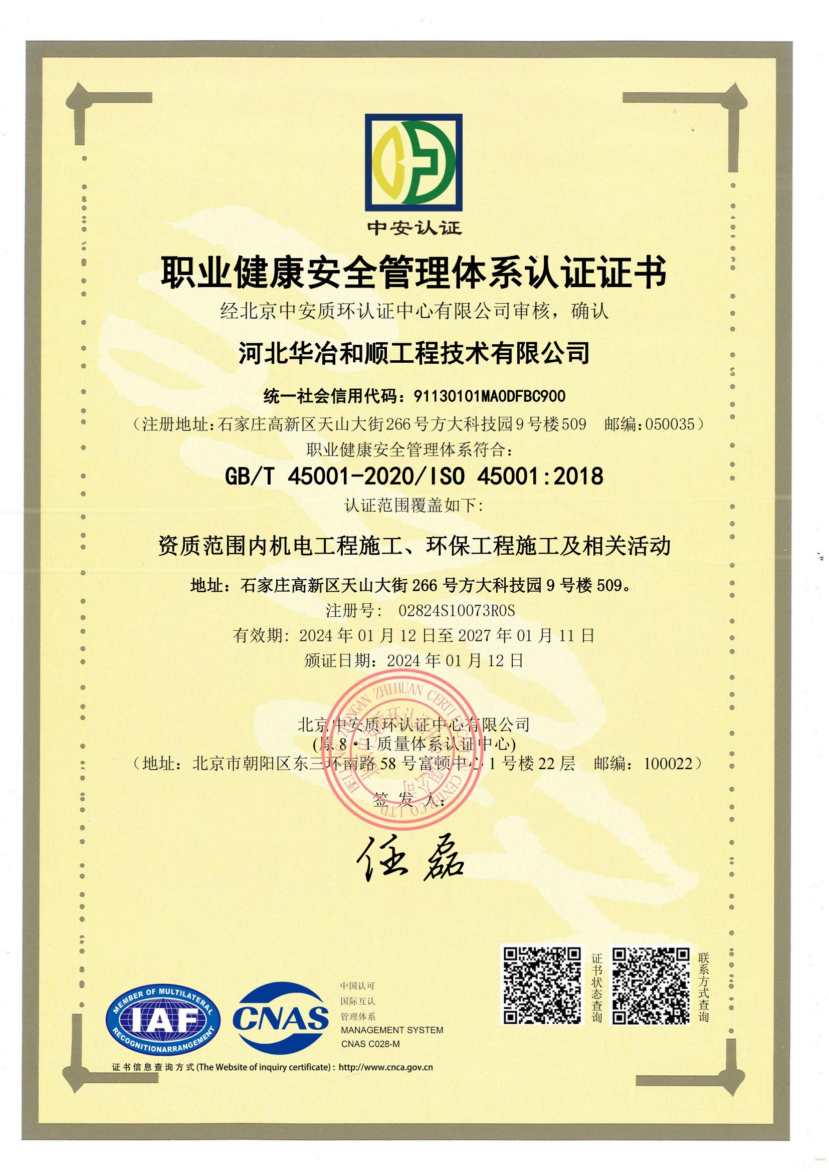 職業(yè)健康安全管理體系認(rèn)證證書