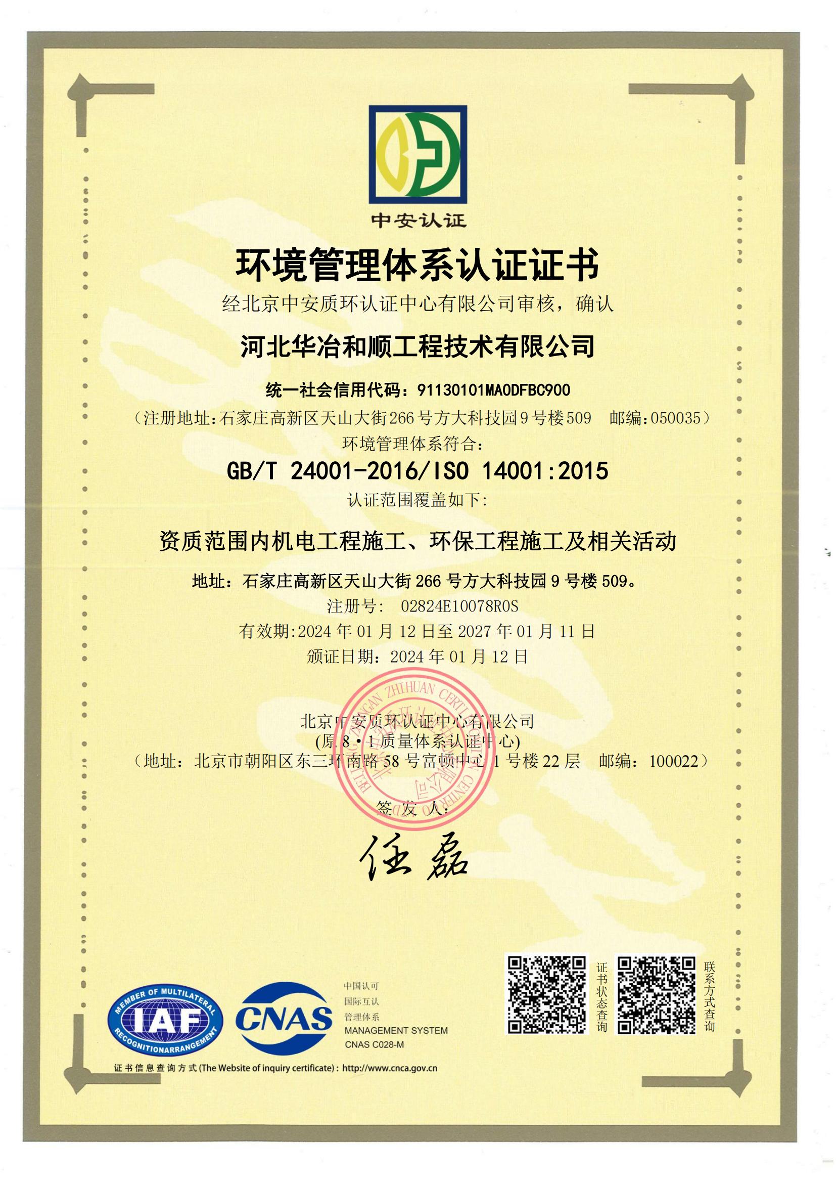 環(huán)境管理體系認(rèn)證證書