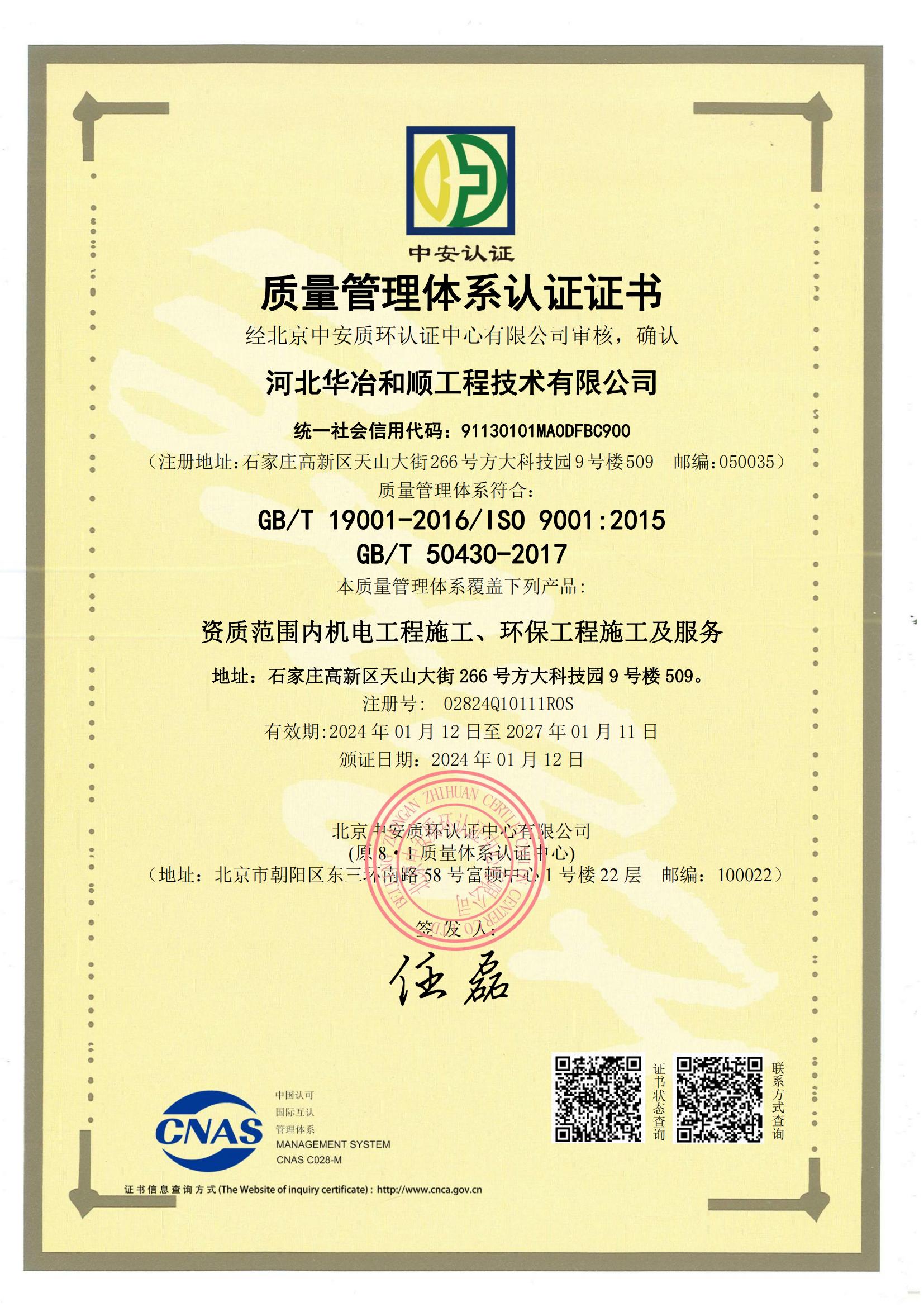 質(zhì)量管理體系認(rèn)證證書
